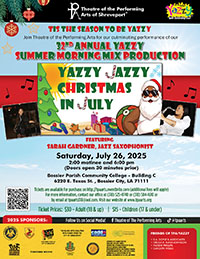 This intensive 7-week program culminates with a grand finale production on Friday, July 26, 6:00 pm, at the Riverview Theatre. This year’s theme is Yazzy Jazzy Christmas in July featuring Sarah Gardner, jazz saxophonist and former Yazzy veteran student. Come join students from all over the parish, as we gain more experience in performing and meet new friends. Participants must audition. Registration fees are $100.00. Scholarships are available on a first come first serve basis. For more information visit our website at www.tpaarts.org or contact our office at 318-525-0740 or 318-584-1610.